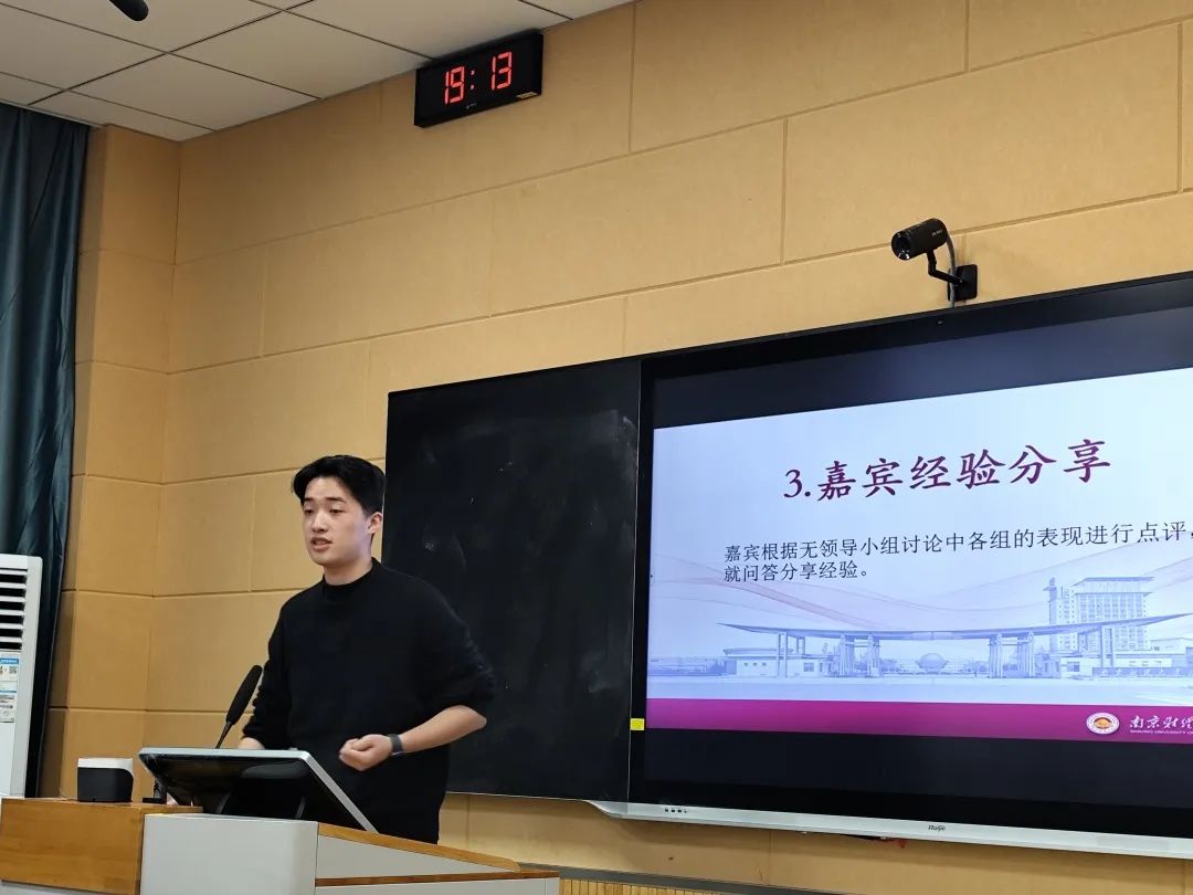 最后是国实2101陈又苹进行分享,她是经济协会主要负责人,参与第六届全国跨境电商专业能力大赛分别获得 BtoB 赛道一等奖、跨境电商物流一等奖,同时获得23年暑假江苏省境外全额奖学金等。她以亲身实习经历和四大等知名企业为例,向同学们讲述校招时拿到的群面题目最长可达10多页。她表示想要在面试中表现好,提前学习掌握技巧,多说多练是必不可少的,与此同时有时间和任务意识,表现得大方得体,和面试官组员有眼神交流也会很加分。贸经2302李翊豪问道:“如何才能在多轮面试中保持良好的心态?” 陈又苹回答:“唯有自身拥有强大实力,才能自信的应对面试中遇到的各种挑战,同学们需要做的,就是不断提升、充实自己。”
